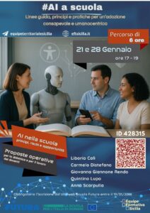 Percorso formativo “#AI a scuola: linee guida, principi e pratiche per un’adozione consapevole e umanocentrica”, organizzato dall’ Équipe Formativa Territoriale (EFT) per la Sicilia; sono previsti due workshop online nelle date 21 gennaio e 28 gennaio 2026, dalle ore 17:00 alle ore 19:00. Durante il percorso, saranno esplorate attività creative e interattive da replicare con gli alunni in classe. Al completamento sarà rilasciato attestato di partecipazione di 6 ore.