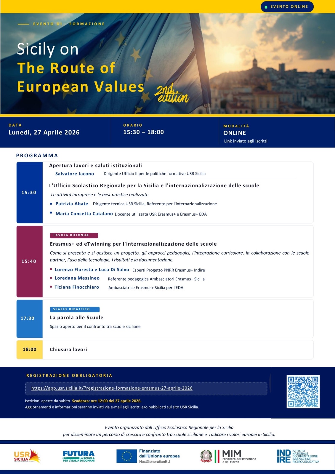 L’Ufficio scolastico regionale per la Sicilia organizza un evento di formazione sui programmi Erasmus+ e Twinning che si svolgerà in modalità telematica, lunedì 27 aprile 2026, dalle ore 15:30 alle ore 18:00. L’incontro formativo, rivolto ai Dirigenti scolastici e ai docenti, mira ad offrire un approfondimento sui progetti europei, con lo scopo di integrare l’offerta dei programmi Erasmus+ ed eTwinning in una dimensione sistemica e di alto valore formativo per l’internazionalizzazione dell’intera comunità scolastica. I partecipanti possono iscriversi mediante la compilazione del form di seguito indicato: https://app.usr.sicilia.it/?registrazione-formazione-erasmus-27-aprile-2026