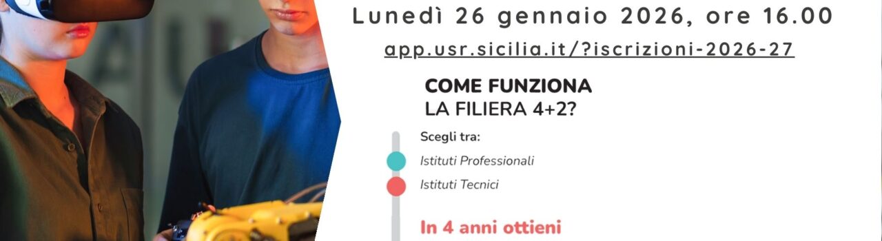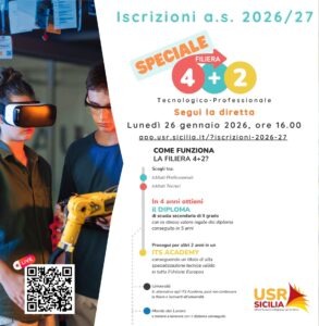 Filiera tecnologico-professionale 4+2: nuovo percorso di studi della durata di quattro anni anziché cinque, al termine dei quali gli studenti, ottenuto il diploma di scuola secondaria di secondo grado, potranno seguire – se vorranno – un ulteriore biennio formativo di specializzazione presso un Istituto Tecnologico Superiore (ITS Academy), conseguendo il diploma di Tecnico Superiore. Se ne parlerà in diretta a questo link: https://app.usr.sicilia.it/?iscrizioni-2026-27, lunedì 26 gennaio alle ore 16, per approfondire l’argomento e rispondere a domande e curiosità.